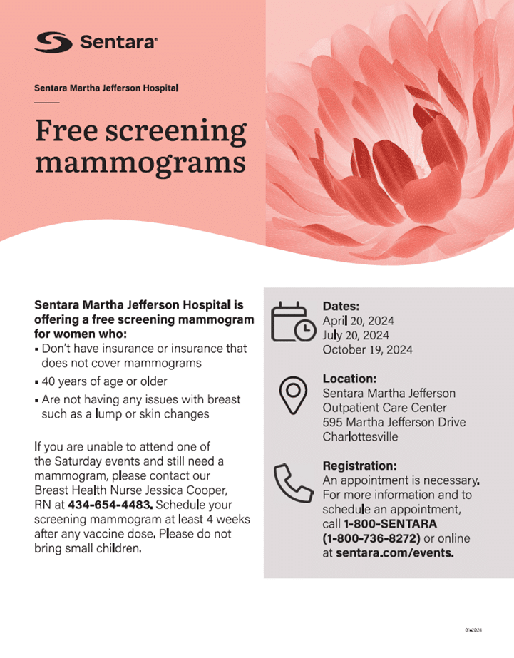 Our 2024 Breast Health Screening Day dates are set! 200 women will have the opportunity to sign up for a mammogram again this year. There will be three Saturday dates (April 20, July 20 and October 19) with spots for 60 women at each event. An additional 20 spots will be offered during the week on normal mammogram days and hours to give the opportunity to those who cannot make a Saturday event. Lab work and breast exams will not be offered based on provider feedback and lack of follow-up after the labs.